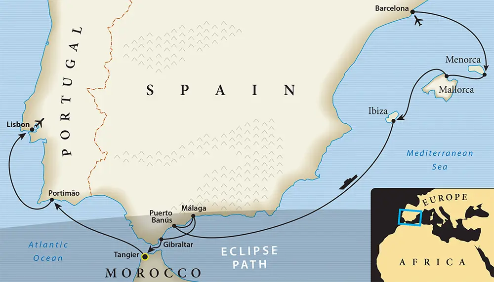 Then, standing guard at the edge of the magnificent Atlantic, we’ll visit the legendary Rock of Gibraltar, often regarded as one of the fabled Pillars of Hercules. From this iconic vantage point, we’ll navigate the straits to reach Tangier, with its sun-drenched alleyways and bustling markets, a jewel perched at the northern edge of Morocco. And from our exclusive, hand selected viewing site, you’ll prepare to witness the spectacular highlight – the longest total solar eclipse of the century sweeping across Northern Africa on August 2, 2027.